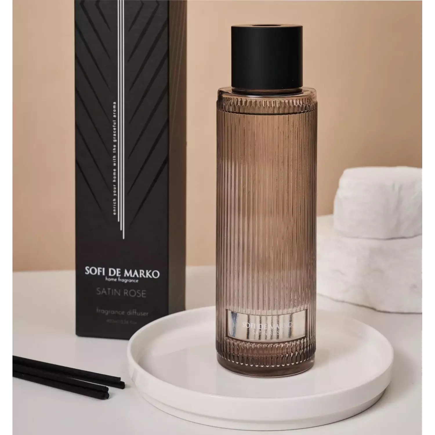 "Satin Rose" новый аромат из коллекции ароматических диффузоров «Black» от Sofi De Marko. Аромат Satin Rose - фруктовый, с нотами персика, розы, агарового дерева, черной смородины и личи. Комплектация: Флакон с ароматическим составом; Ротанговые палочки – 8 шт. Располагать диффузор лучше в центра...