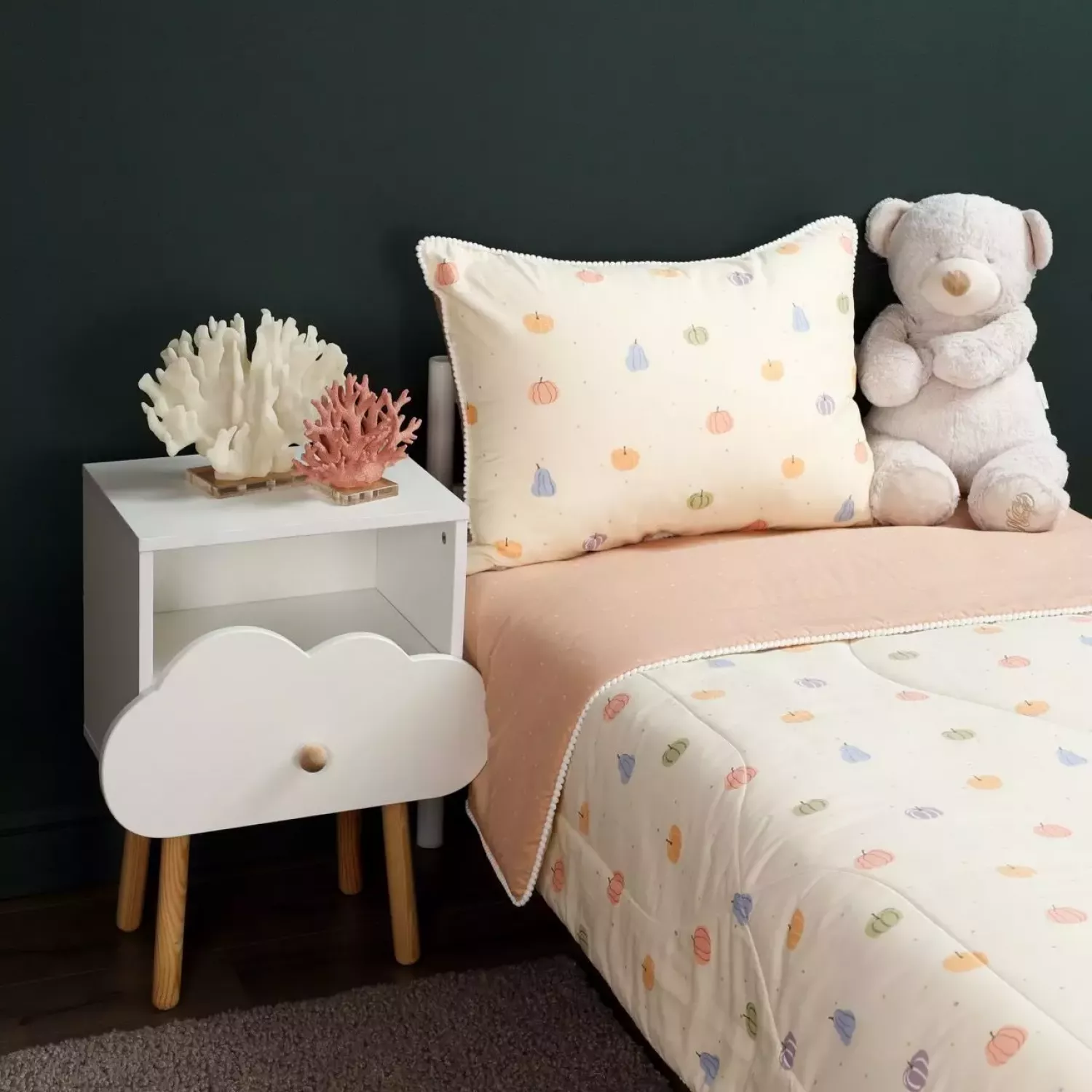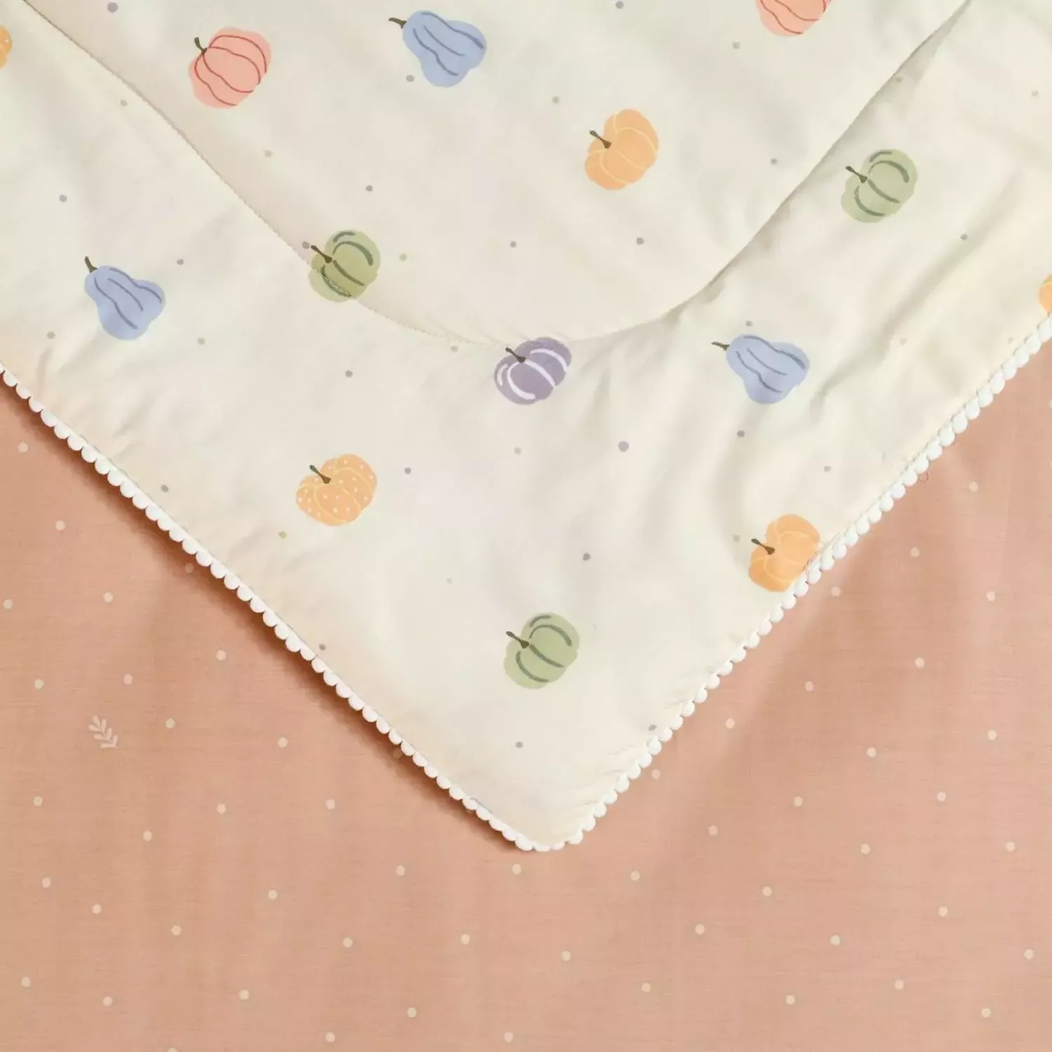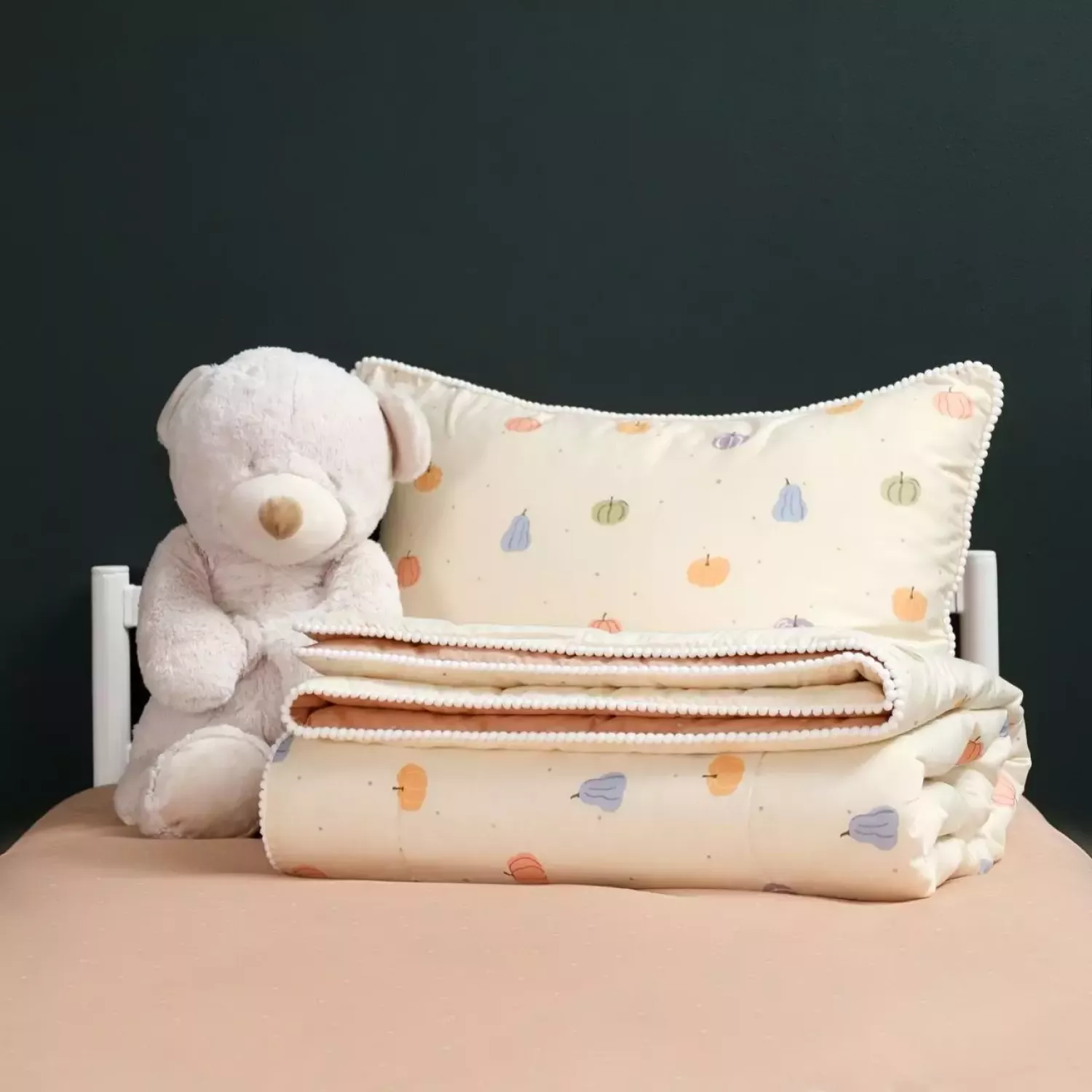 Комплект «Тыковка» сочетает в себе премиальное качество, гипоаллергенные материалы и комфортный дизайн. Одеяло с лёгким микроволоконным наполнителем и без пододеяльника облегчает уход. Яркие расцветки с оригинальными декоративными элементами создают атмосферу уюта и радости в детской комнате.