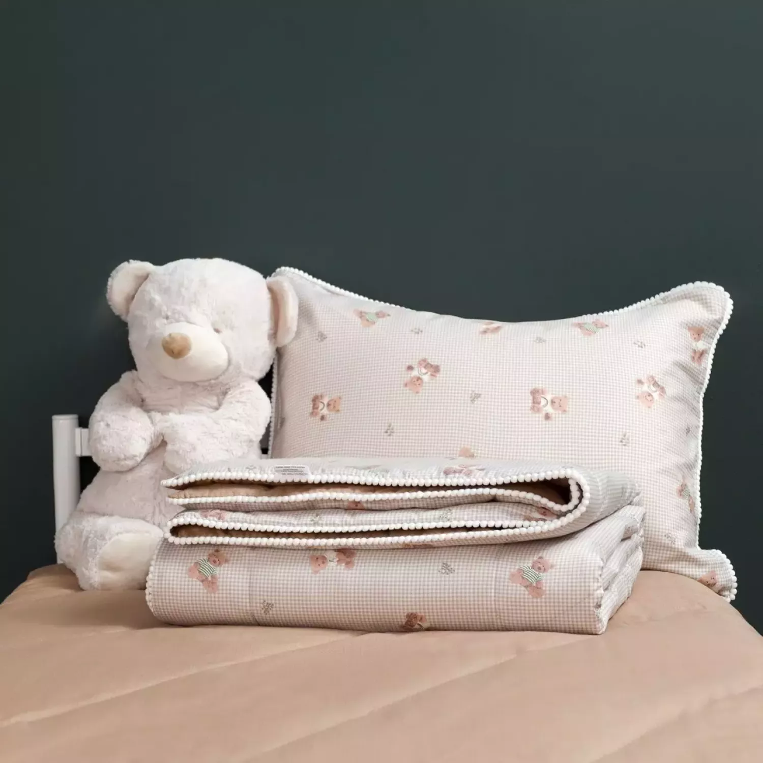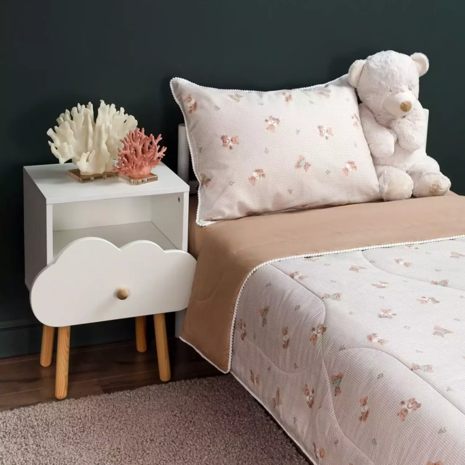Комплект «Паддингтон» сочетает в себе премиальное качество, гипоаллергенные материалы и комфортный дизайн. Одеяло с лёгким микроволоконным наполнителем и без пододеяльника облегчает уход. Яркие расцветки с оригинальными декоративными элементами создают атмосферу уюта и радости в детской комнате.