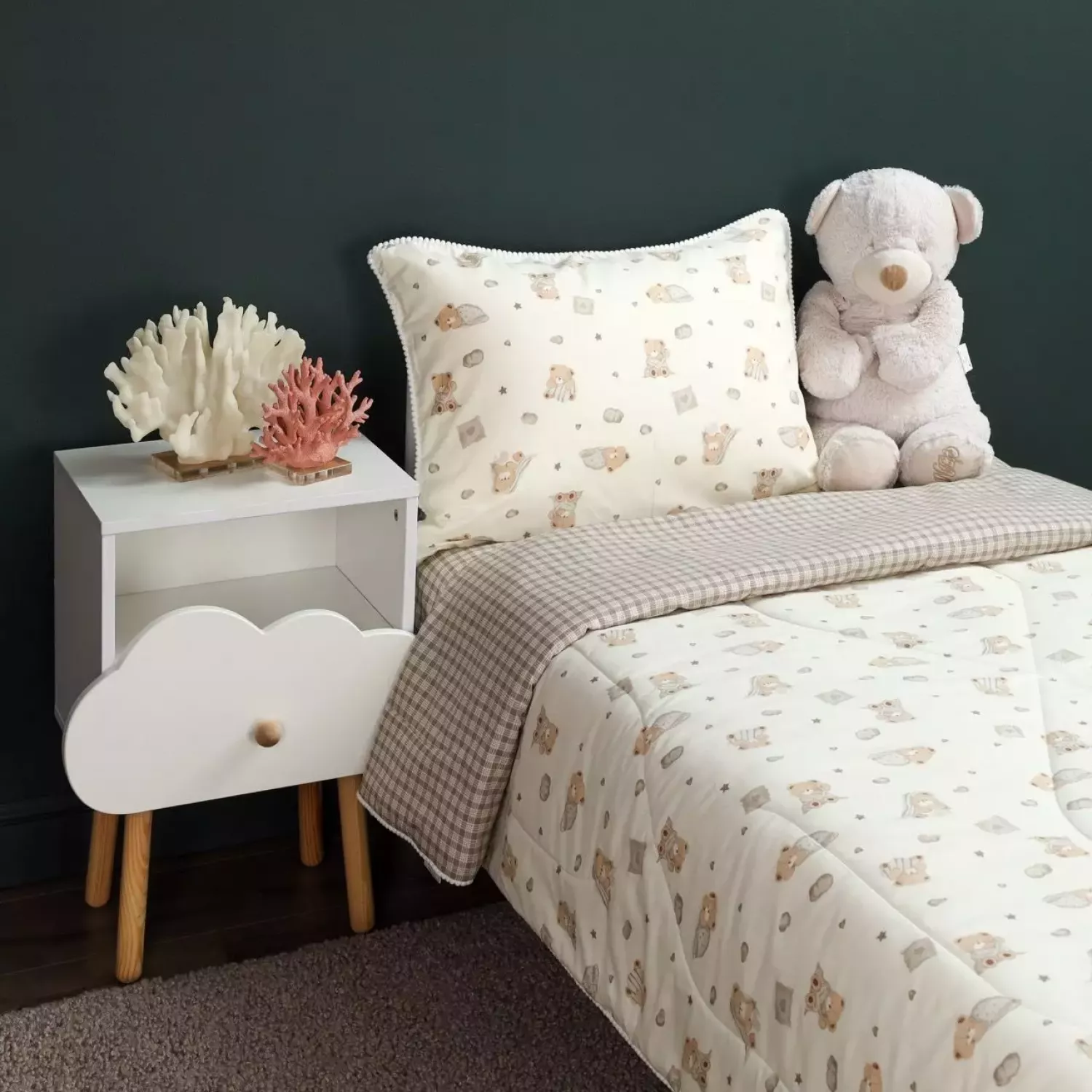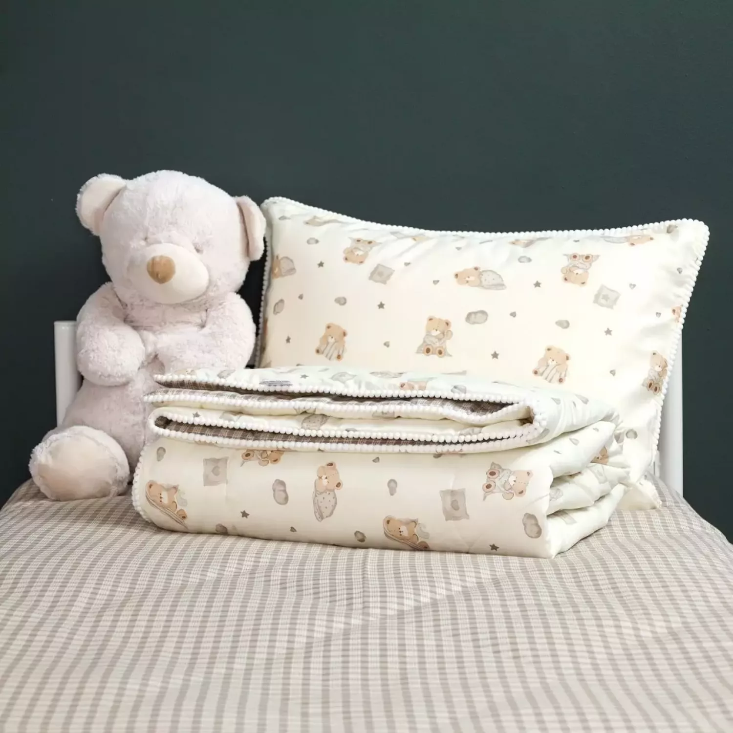 Комплект «Мишутки» сочетает в себе премиальное качество, гипоаллергенные материалы и комфортный дизайн. Одеяло с лёгким микроволоконным наполнителем и без пододеяльника облегчает уход. Яркие расцветки с оригинальными декоративными элементами создают атмосферу уюта и радости в детской комнате.
