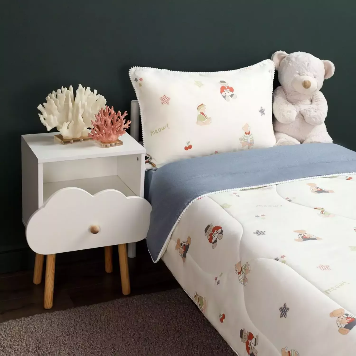 Комплект «Мишка» сочетает в себе премиальное качество, гипоаллергенные материалы и комфортный дизайн. Одеяло с лёгким микроволоконным наполнителем и без пододеяльника облегчает уход. Яркие расцветки с оригинальными декоративными элементами создают атмосферу уюта и радости в детской комнате.