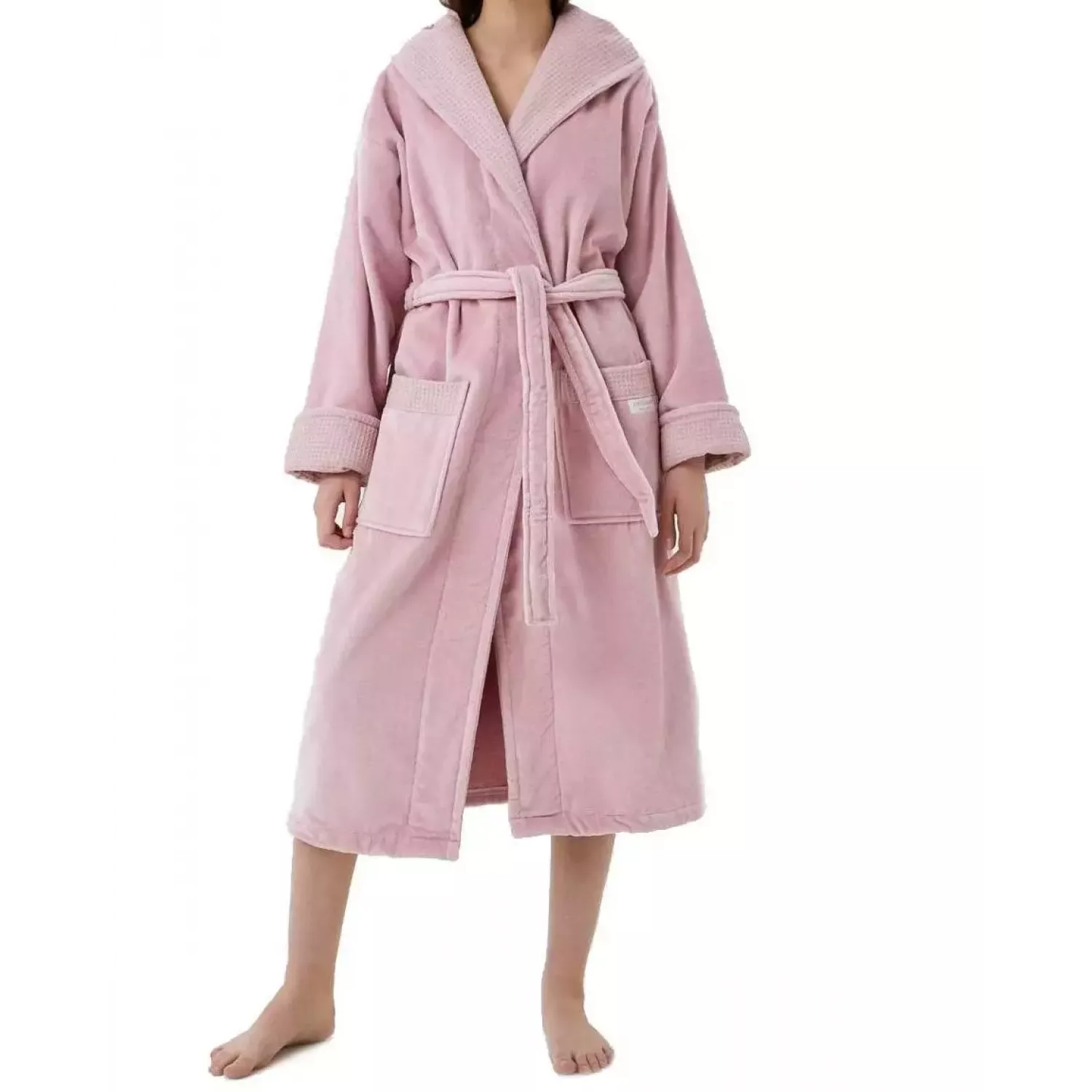 Халат запахивается на пояс, также есть капюшон и два накладных кармана по бокам изделия логотипом.