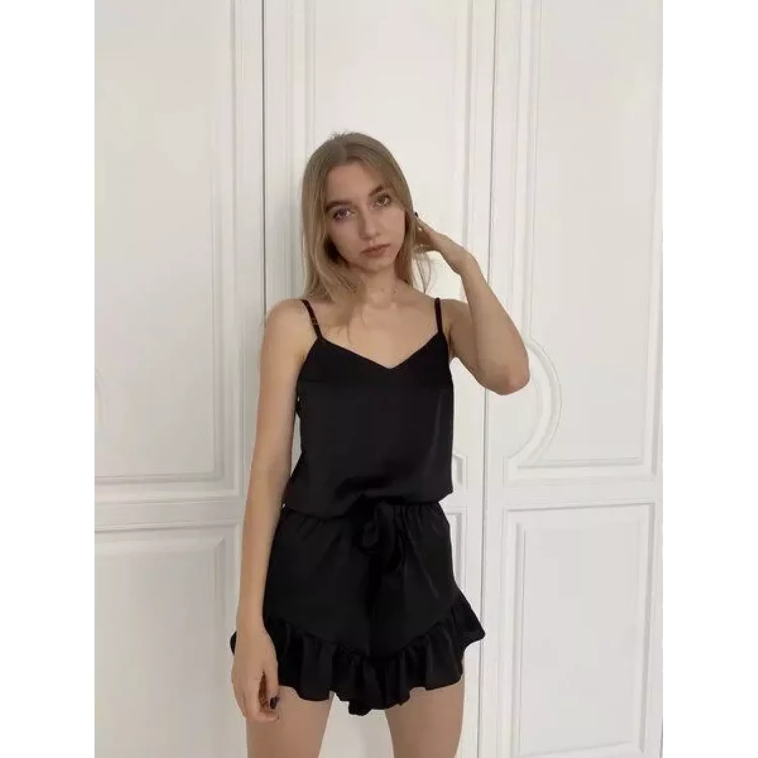 Пижама состоит из шорт на высокой посадке, украшенных рюшами и топа на тонких бретелях.