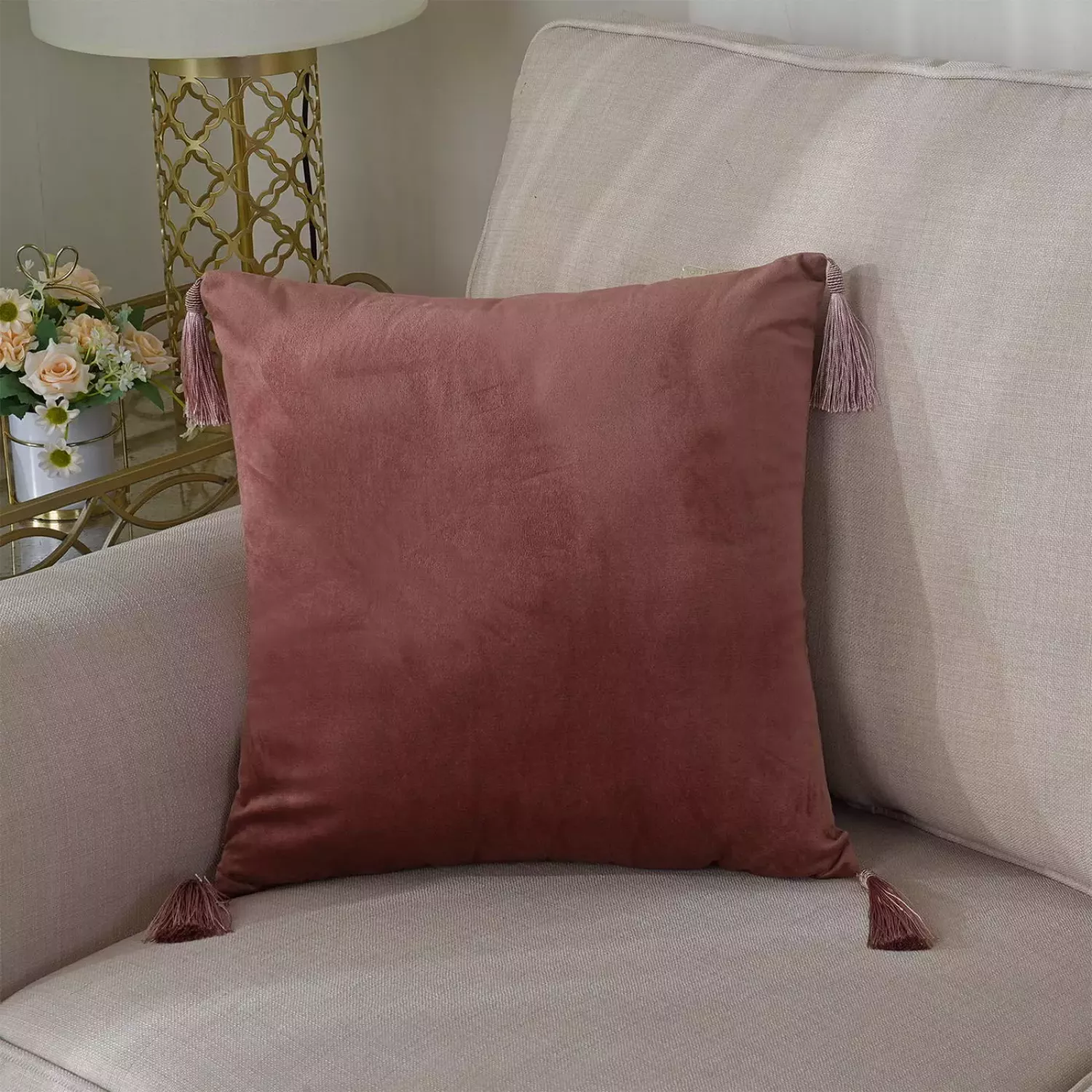 Стильные наволочки выполнены из велюра, отделаны декорированными кисточками. В составе 100% вискоза наивысшего качества. Они потрясающе выглядят и невероятно практичны. В наличии большой ассортимент цветов.