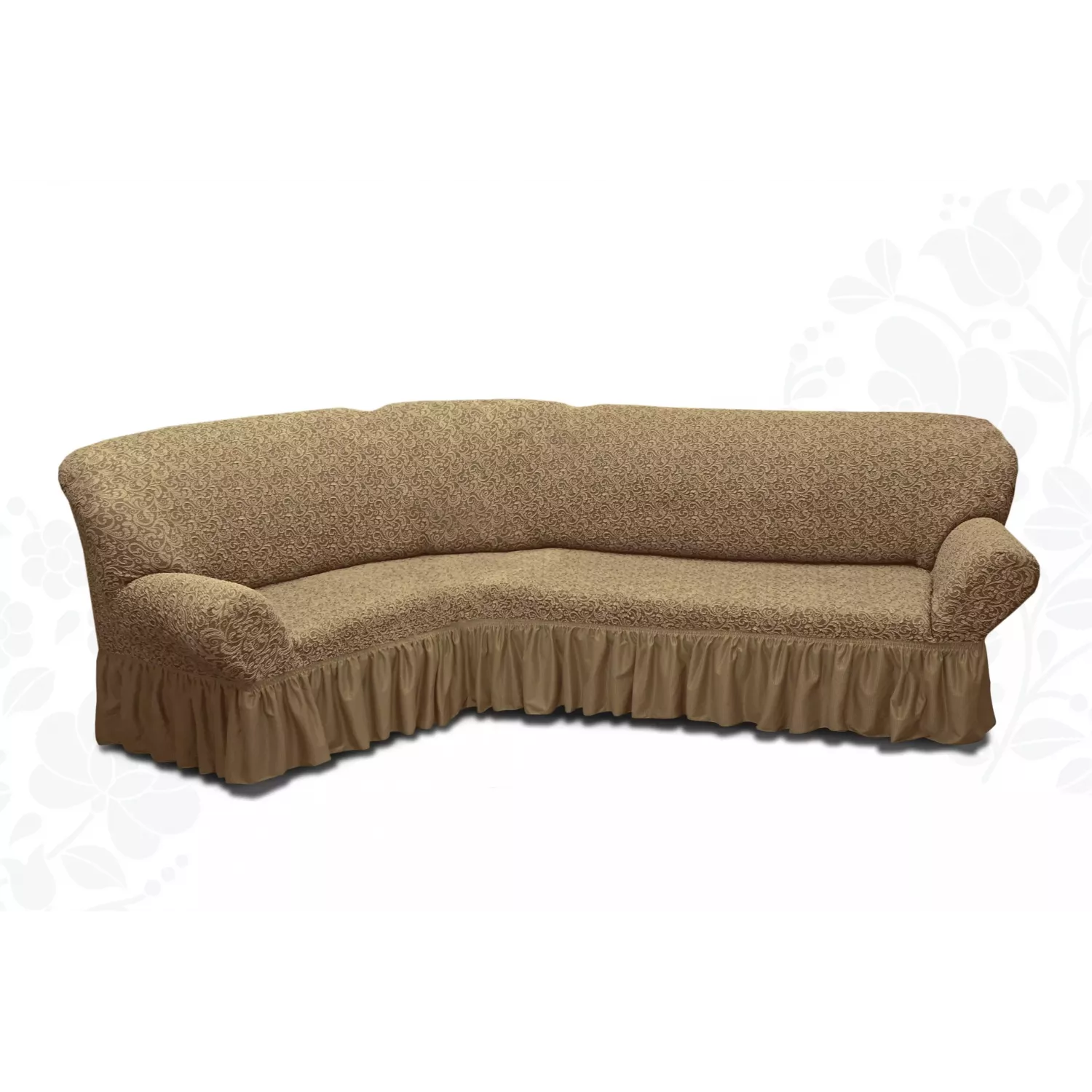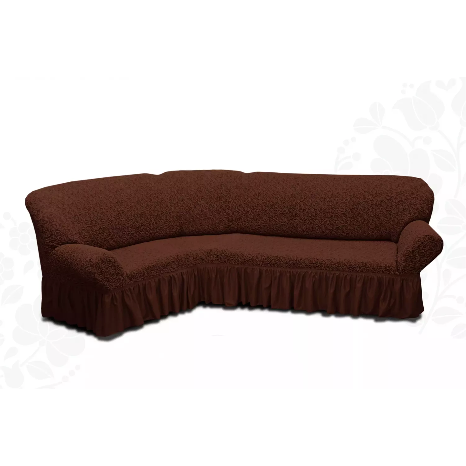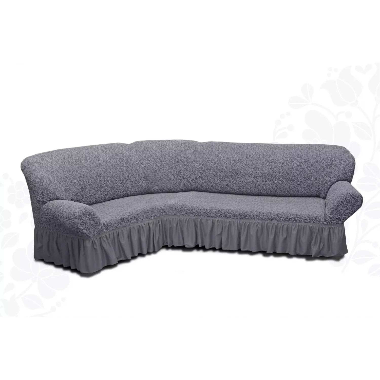 Жаккардовые чехлы для углового дивана с оборкой в увеличенном размере – евро. Отличаются высокой плотностью и красивым фактурным рисунком.