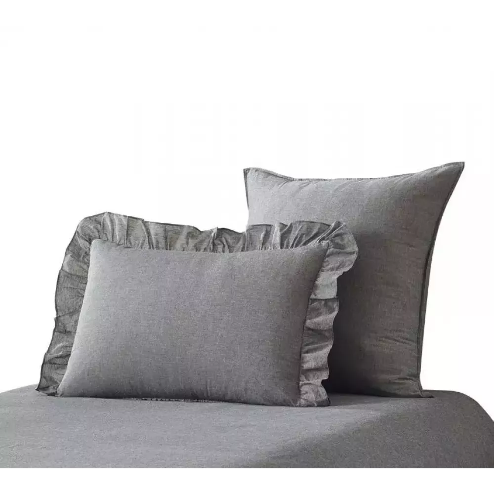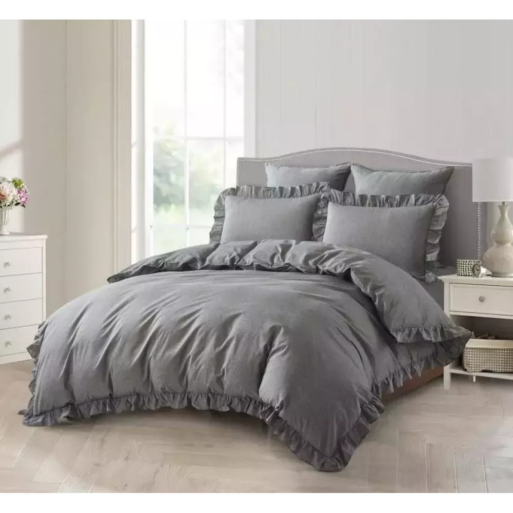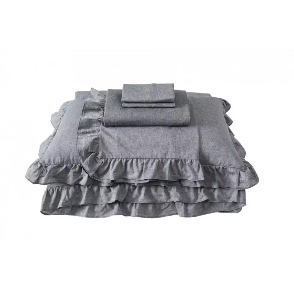 Пододеяльник украшен рюшами с трех сторон, имеет скрытую молнию. В наборе наволочки на клапане: две наволочки размером 50х70 с красивыми рюшами и две размером 70х70.
