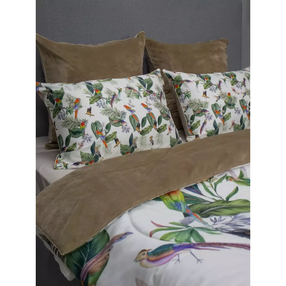 В комплект входят 4 наволочки, двусторонние, на молнии. Две наволочки размером 50х70 см с одной стороны из хлопка с цветочными принтами, а с другой — из однотонного велюра. Две наволочки размером 70х70 см выполнены полностью из велюра, добавляя комплекту гармонию и стиль. Все наволочки имеют изысканную окантовку, которая подчёркивает премиальность комплекта.