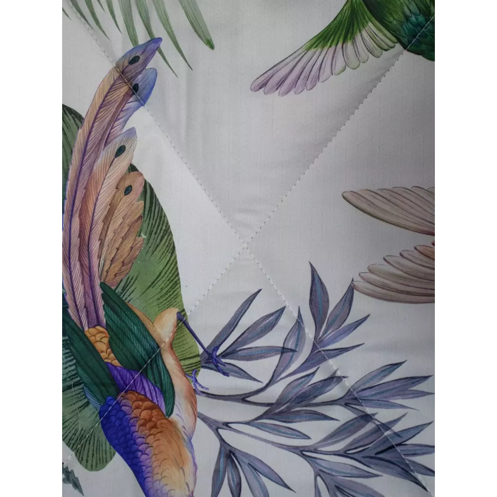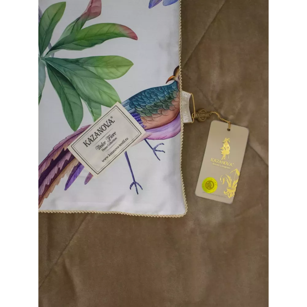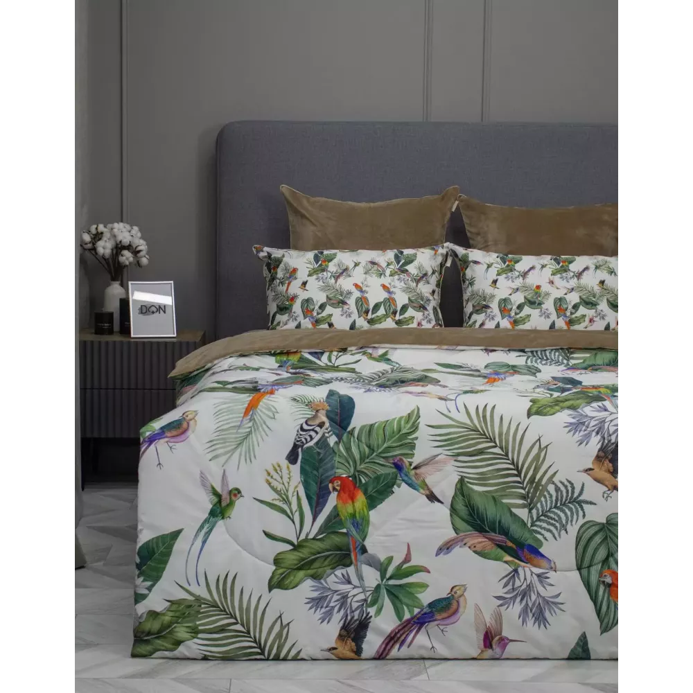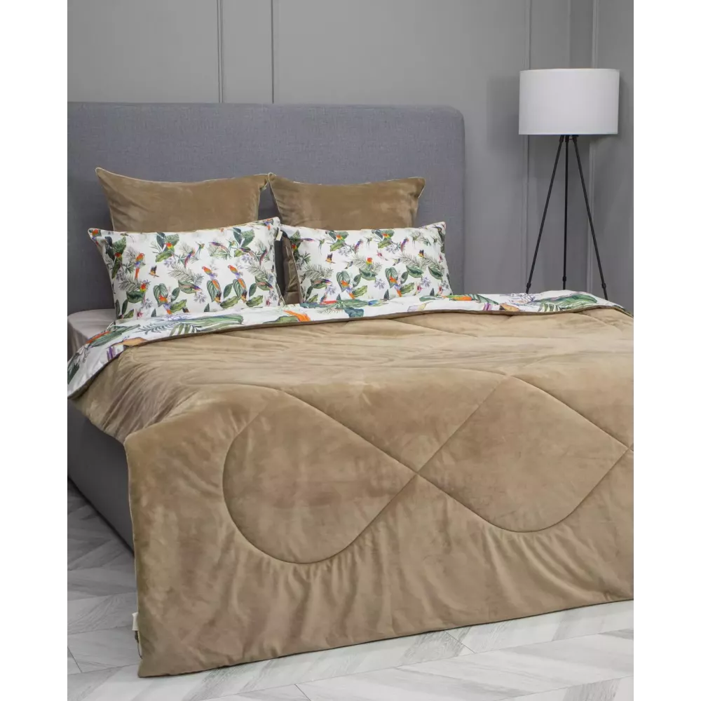Оригинальная стёжка, отделанная витым кантом с трёх сторон. Одеяло двустороннее: одна сторона из египетского хлопка с цветочным принтом, а другая — из однотонного велюра, что позволяет менять акценты в интерьере и делать постель как стильным покрывалом, так и уютным одеялом для сна.