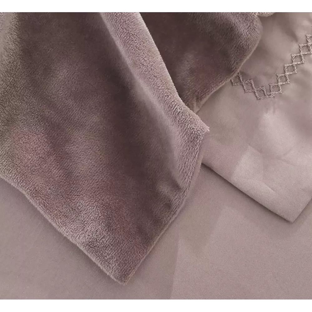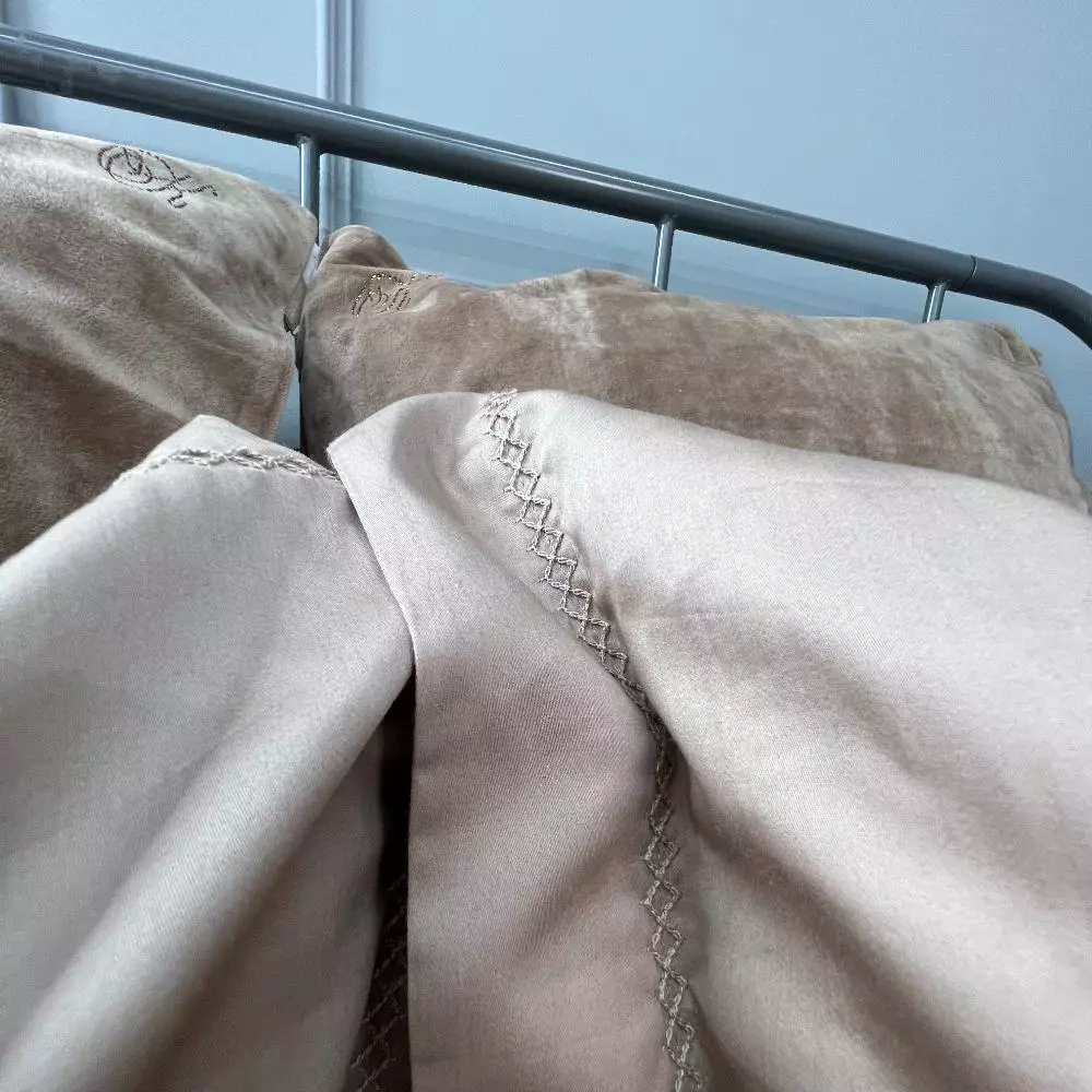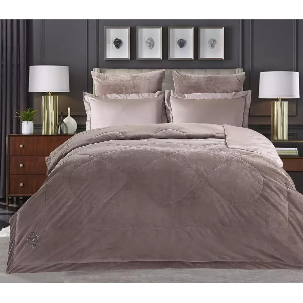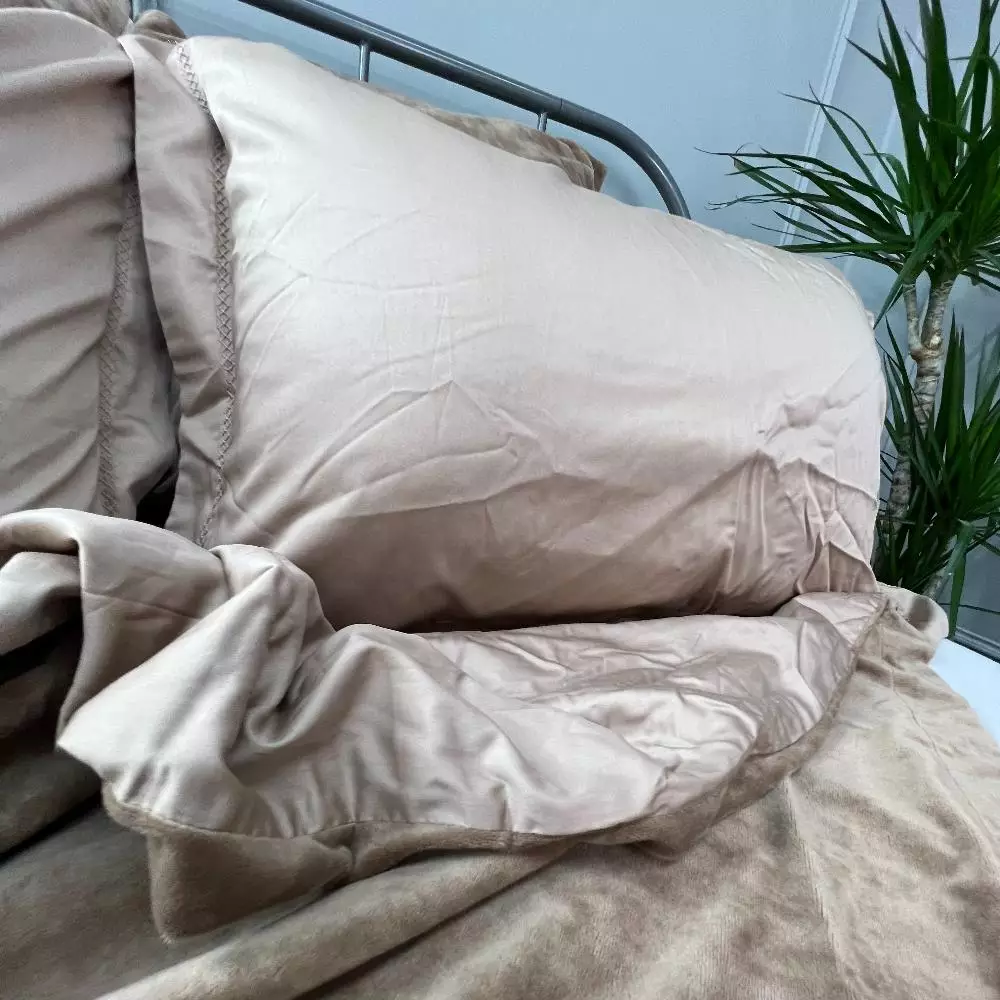 Это бельё удивляет каждый день. С одной стороны — благородный египетский хлопок, создающий атмосферу чистоты и лёгкости, с другой — мягкий велюр, дарящий теплоту и уют. Перевернув одеяло, вы получаете стильное покрывало, которое можно использовать и днём. Под велюром невозможно замёрзнуть, а мягкость египетского хлопка дарит коже невероятный комфорт. Удобные наволочки на молнии с оригинальной отделкой «мережка» и украшенные стразами наволочки создают элегантный и премиальный вид. Этот комплект напоминает «премиум-отель», но остаётся удобным и универсальным в повседневном использовании.