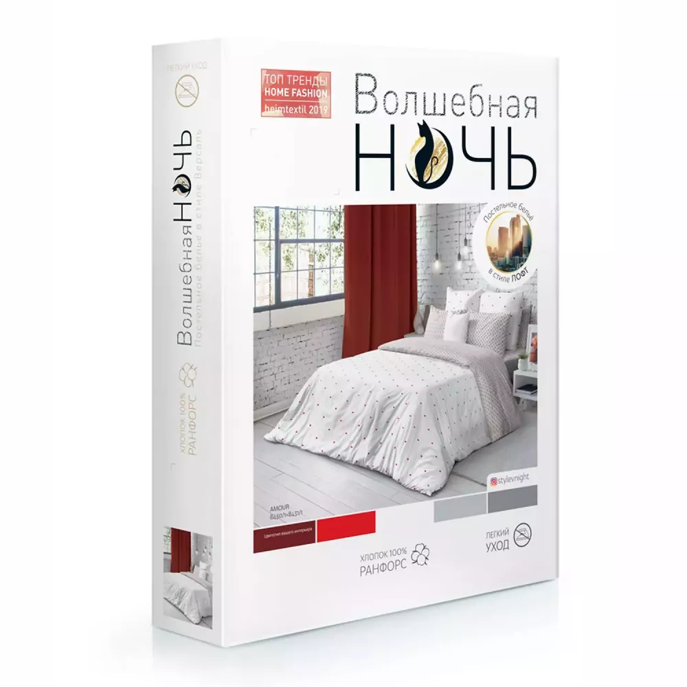 Комплект постельного белья Волшебная ночь "Amour" от текстильной компании НордТекс. Изготавливается из натуральной хлопковой ткани ранфорс, которая похожа на бязь, но нить используется тоньше и более частого переплетения, что придает мягкости и плотности, долговечности изделию. В процессе вычесы...