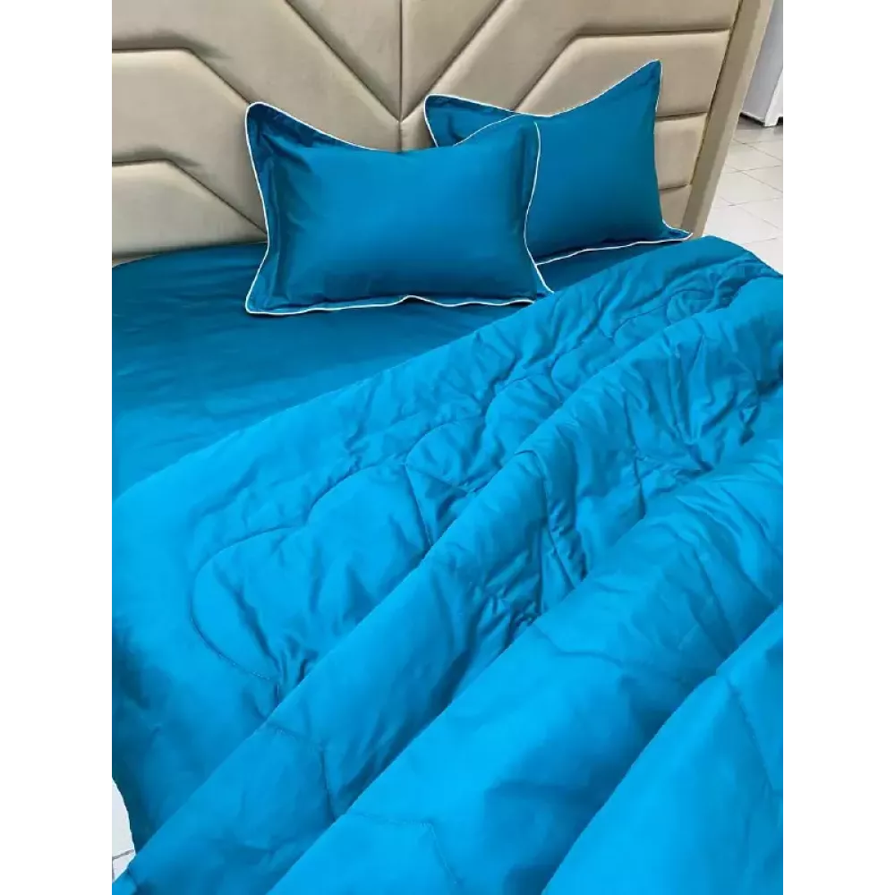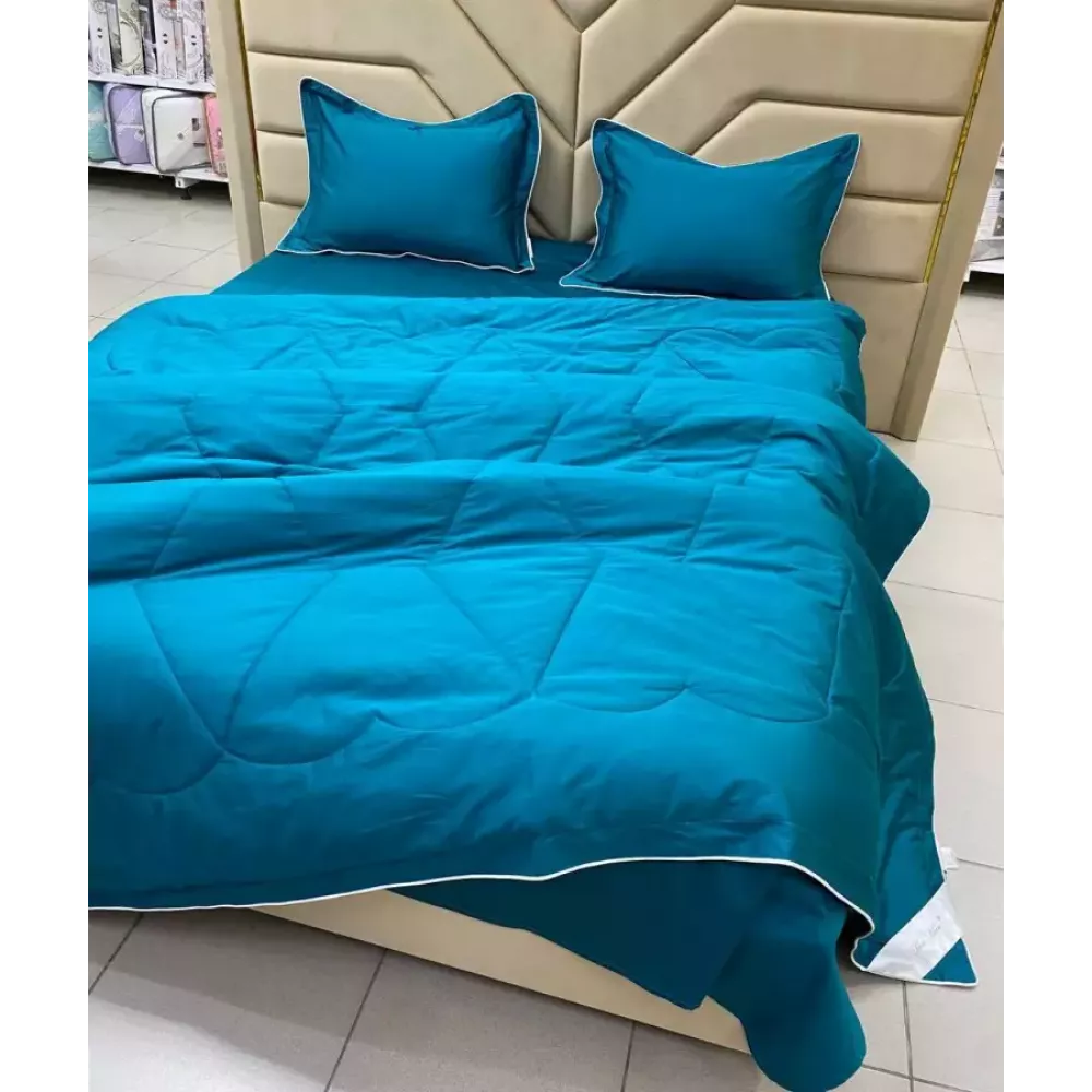 Одеяло с очень современным наполнителем средней толщины, максимально универсальное, можно использовать в любое время года. Оно прекрасно выдерживает стирки, быстро сохнет и наполнитель не сбивается. Одеяло комфортное и дышащее. Отделка красивым кантом придаёт стиля комплекту. Также с ушками и кантом наволочки 50х70.