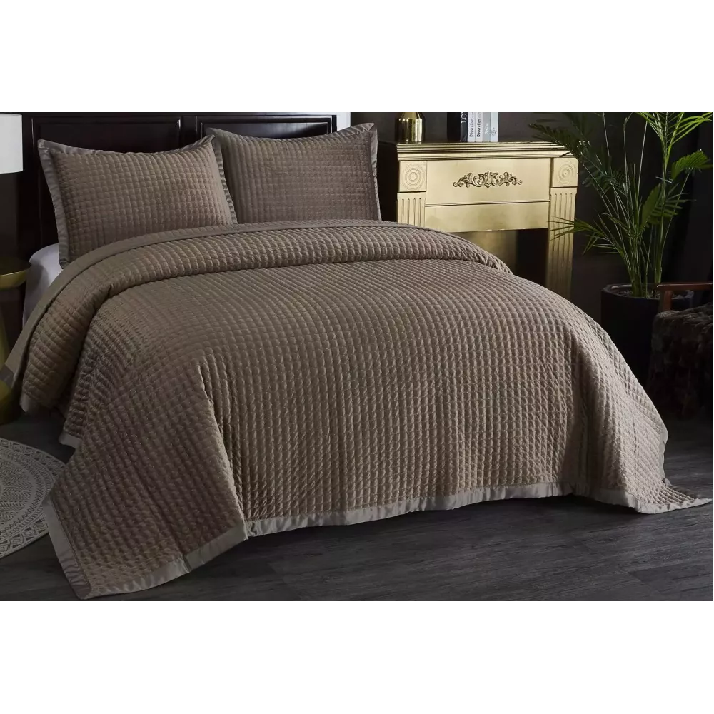 Очень качественное, стильное и современное покрывало с качественной стежкой нитками “Лоретта” (капучино) от Софи Де Марко. Верхняя сторона – невероятно мягкий велюр, основа – ткань. Покрывало отличается долговечностью, практичностью, мягкостью и особым стилем, а так же большим размером, красивой окантовкой покрывала и наволочек. Покрывало упаковано в фирменную упаковку ПВХ на молнии с логотипом бренда “Sofi De Marko”.
