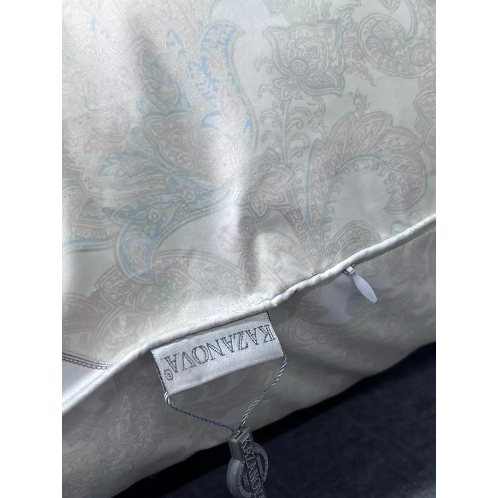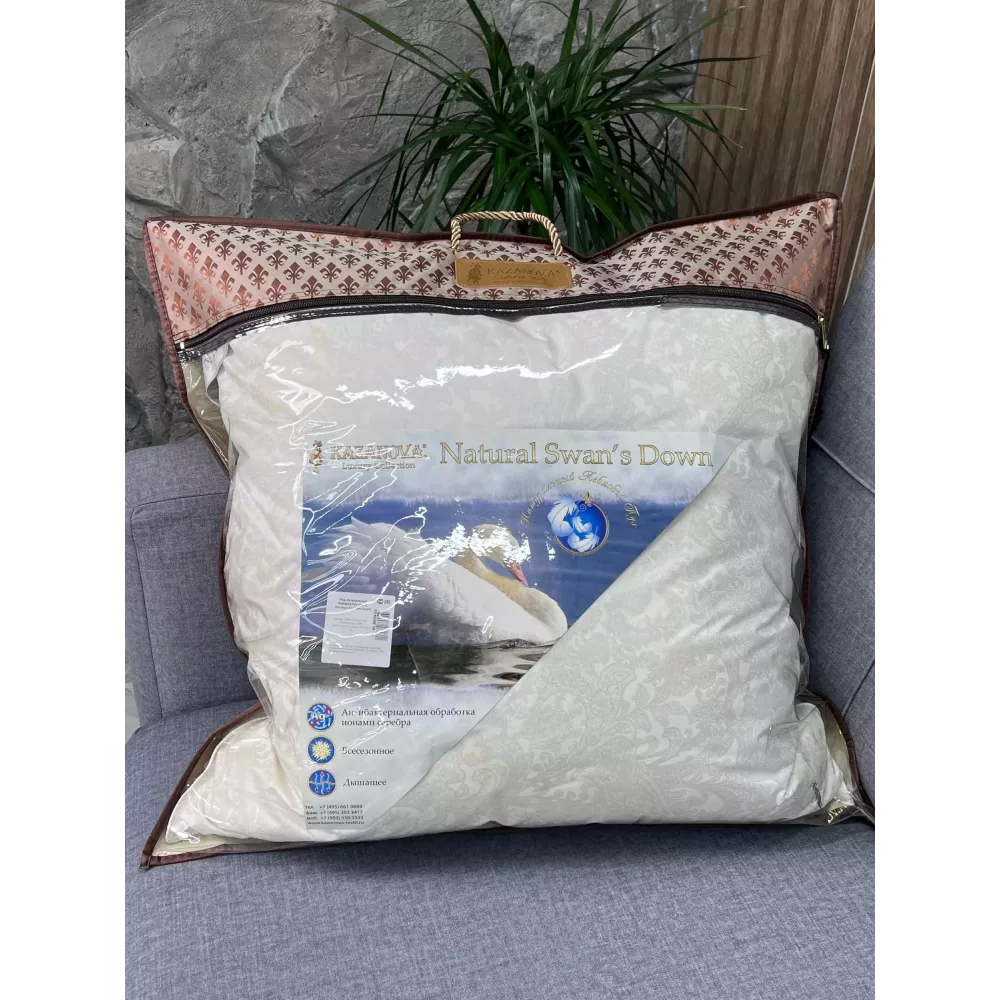 Коллекция "Натуральный Лебяжий Пух" от производителя Kazanov.a выполнена из высококачественного пуха высшей категории. Чехол подушки изготовлен из сатин-вискозы. Ткань пуходержащая, благодаря своей текстуре не скользит в наволочках. Элементами отделки служат: отделочный кант, тканая шелковистая угловая лента и лейбл. Подушки упакованы в жаккардовой сумке с витыми шелковыми ручками.