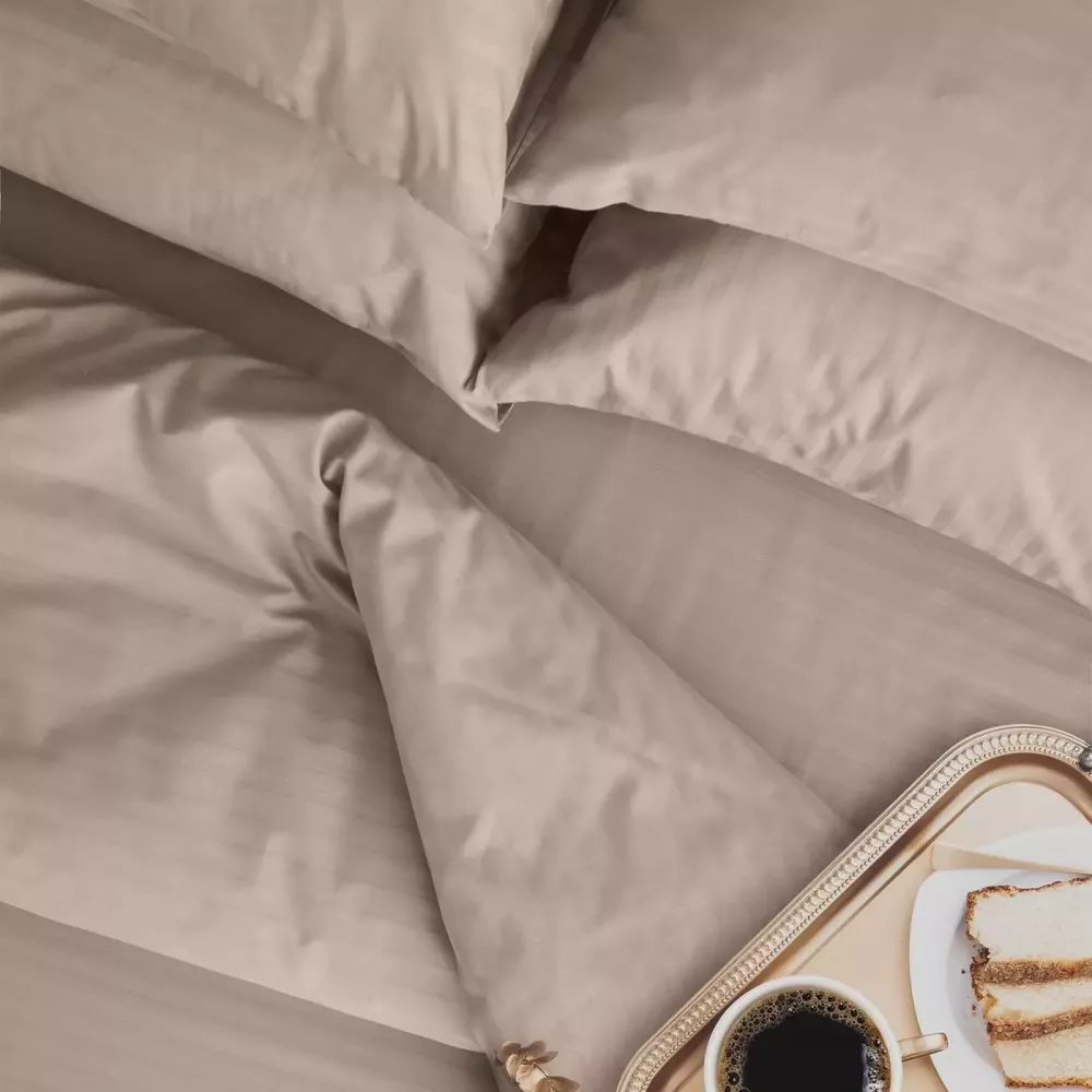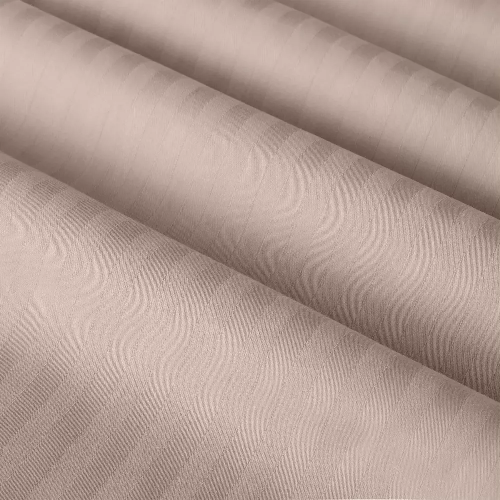 Благодаря такой структуре ткань очень долговечная, износостойкая, выдерживает огромное количество стирок, при этом остаётся нежной, приятной на ощупь и обеспечивает комфортный сон. Классический внешний вид со сложным переплетением в полоску может украсить интерьер любой спальни.