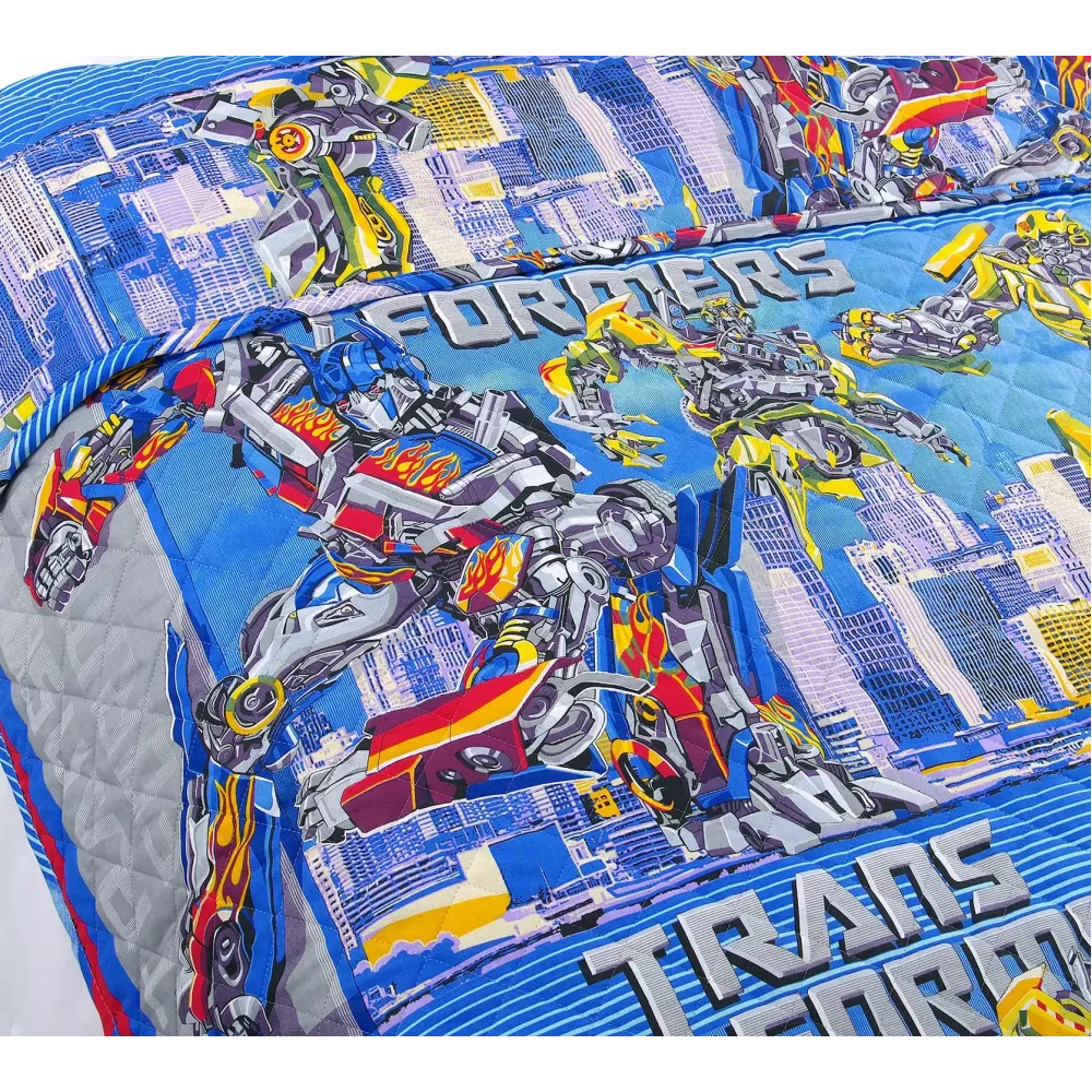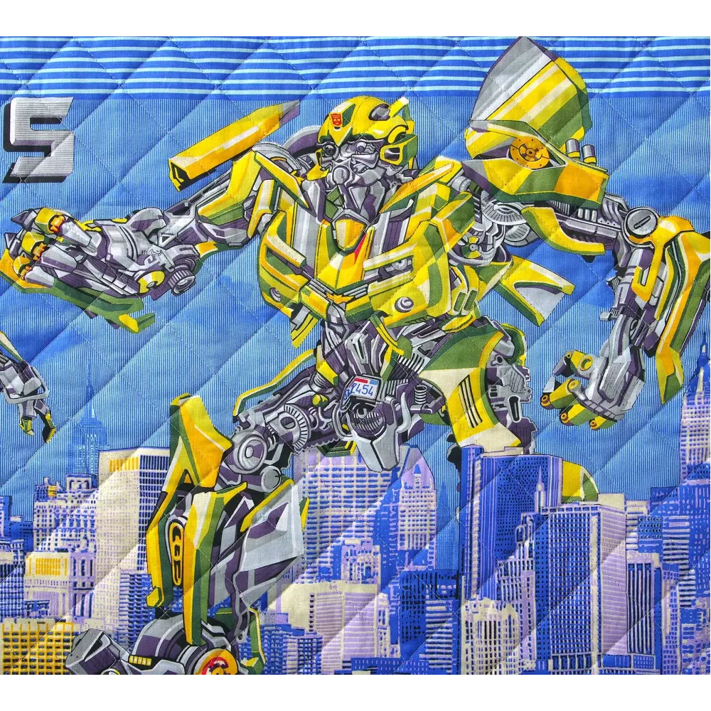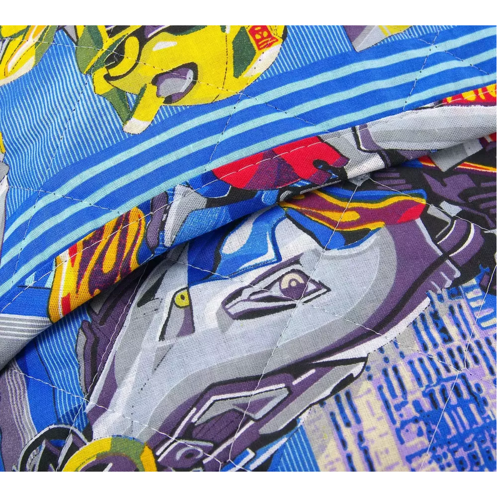 Стеганое покрывало из натуральной ткани "Трансформеры" от текстильной компании ТексДизайн. Ткань из перкаля приятная на ощупь и дышащая, так как она из 100% хлопка. Поэтому покрывалом можно укрываться. Такая ткань по плетению похожа на бязь, но нить используется тоньше и более частого переплетен...