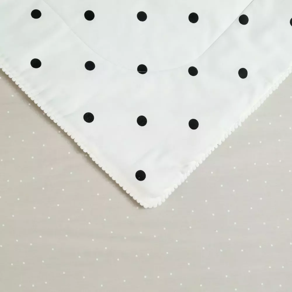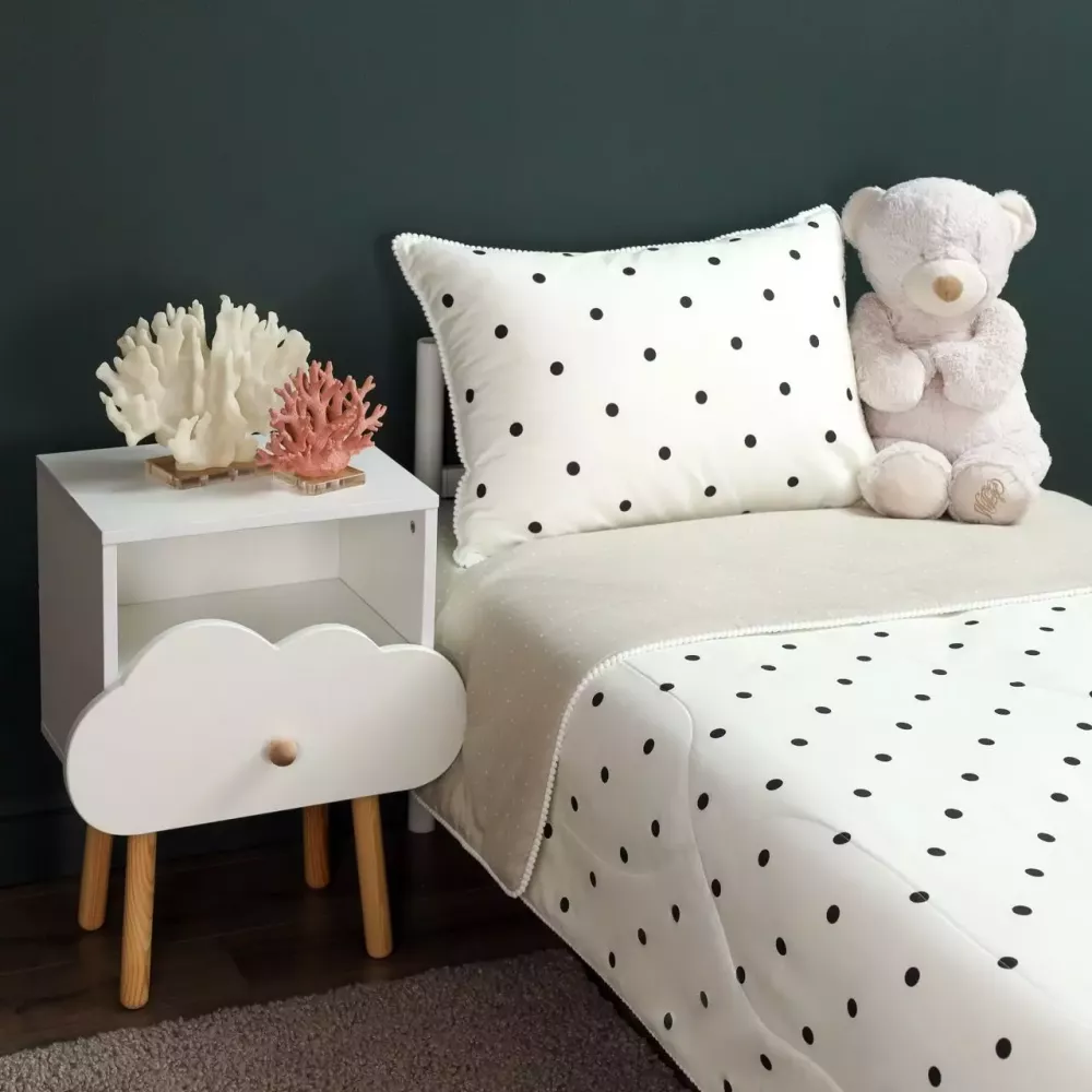Комплект «Горошек» сочетает в себе премиальное качество, гипоаллергенные материалы и комфортный дизайн. Одеяло с лёгким микроволоконным наполнителем и без пододеяльника облегчает уход. Расцветки с оригинальными декоративными элементами создают атмосферу уюта и радости в детской комнате.