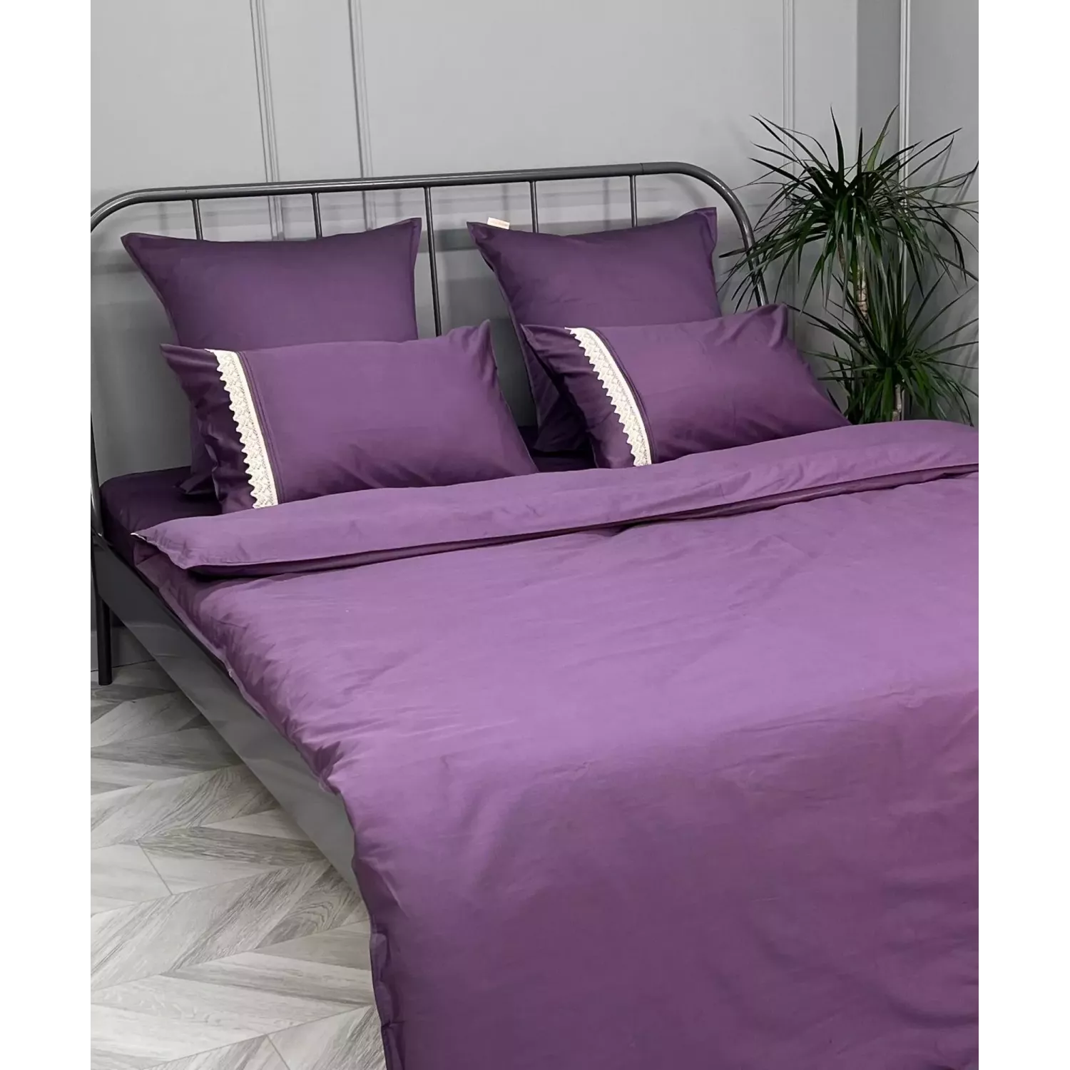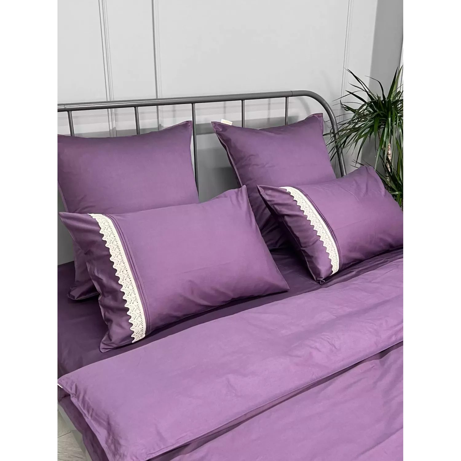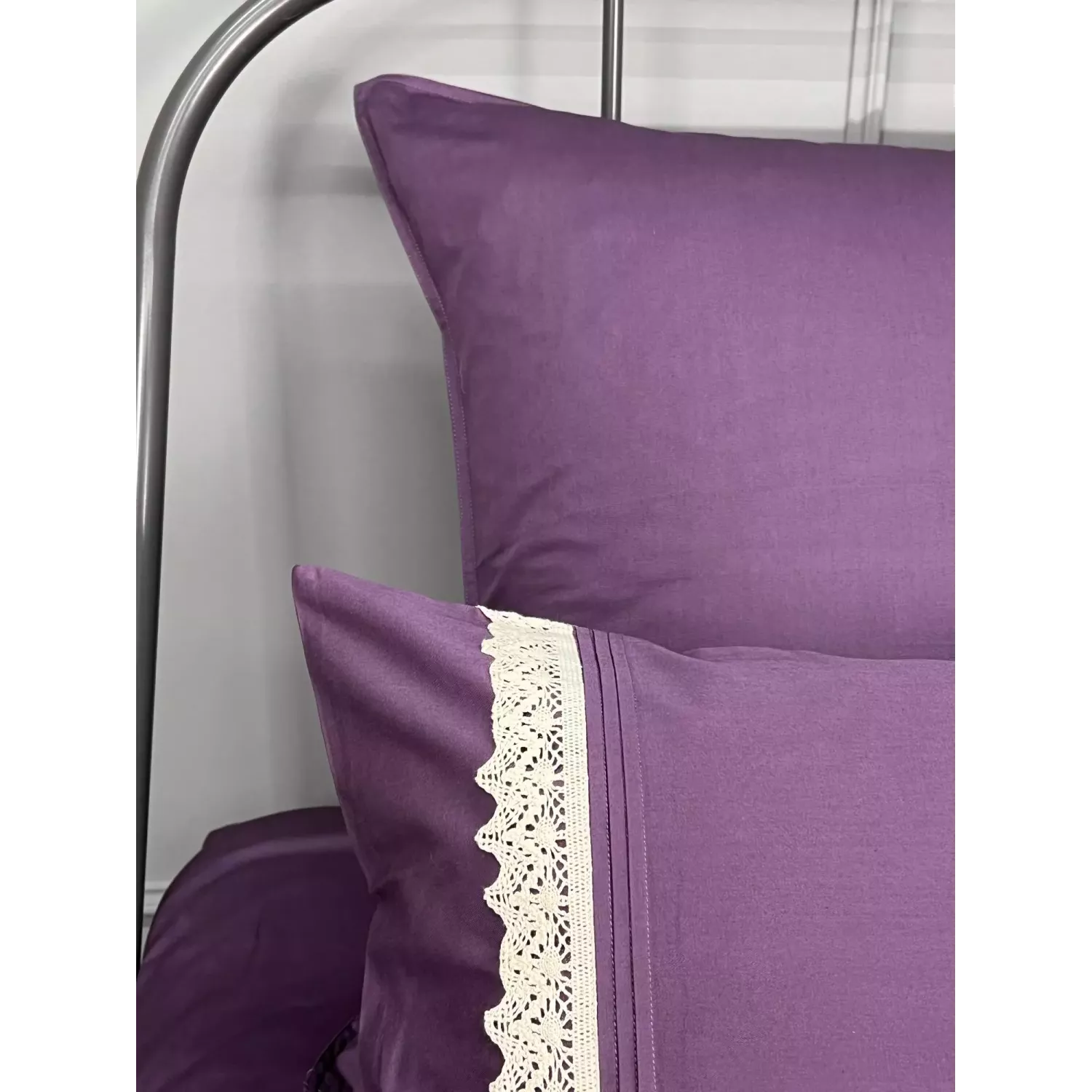 Пододеяльник имеет скрытую молнию, в наборе так же две однотонные наволочки 70х70 и две наволочки 50х70, которые выполнены с оригинальной кружевной полосой. Наволочки на запах, а пододеяльник также имеет кружевную полосу по краю.