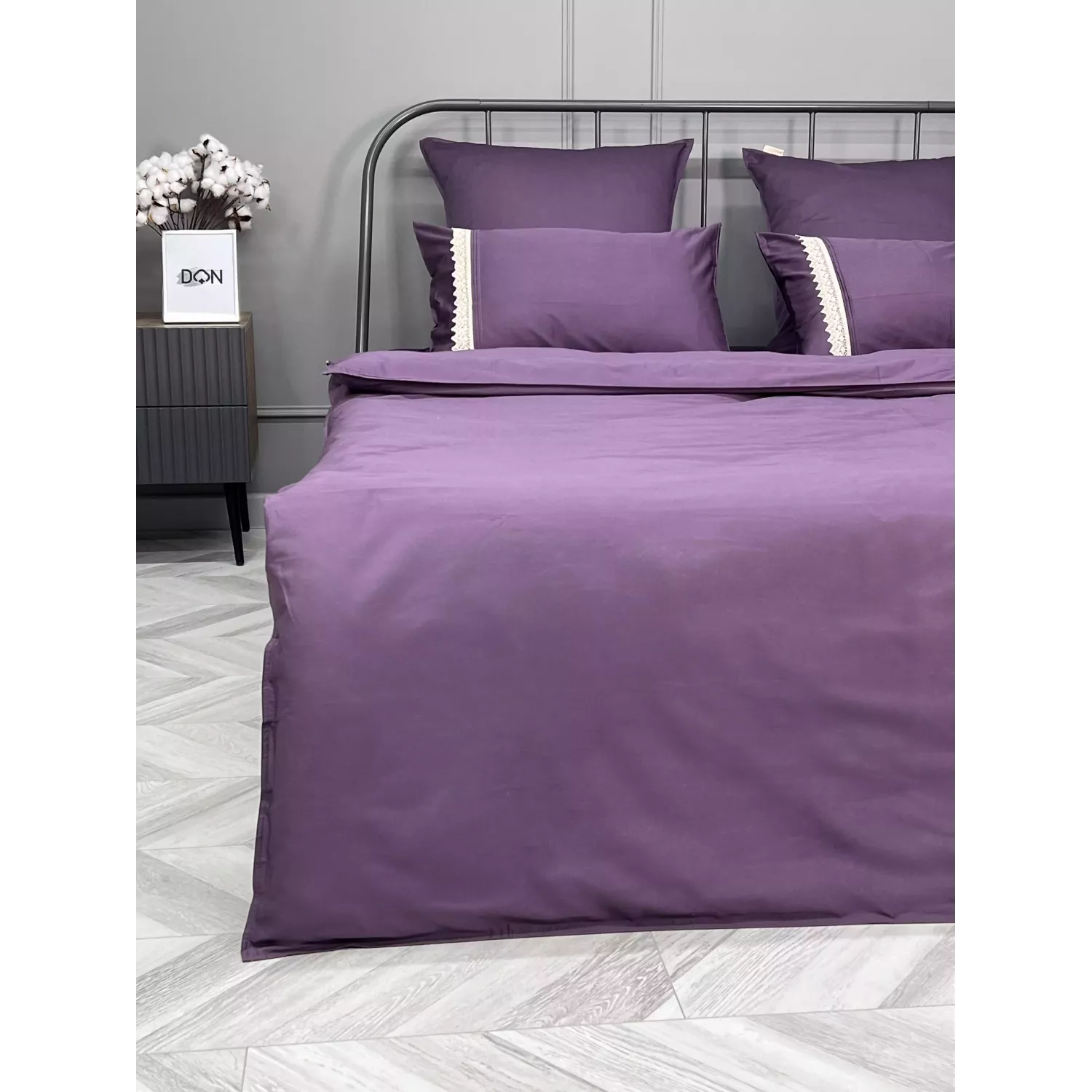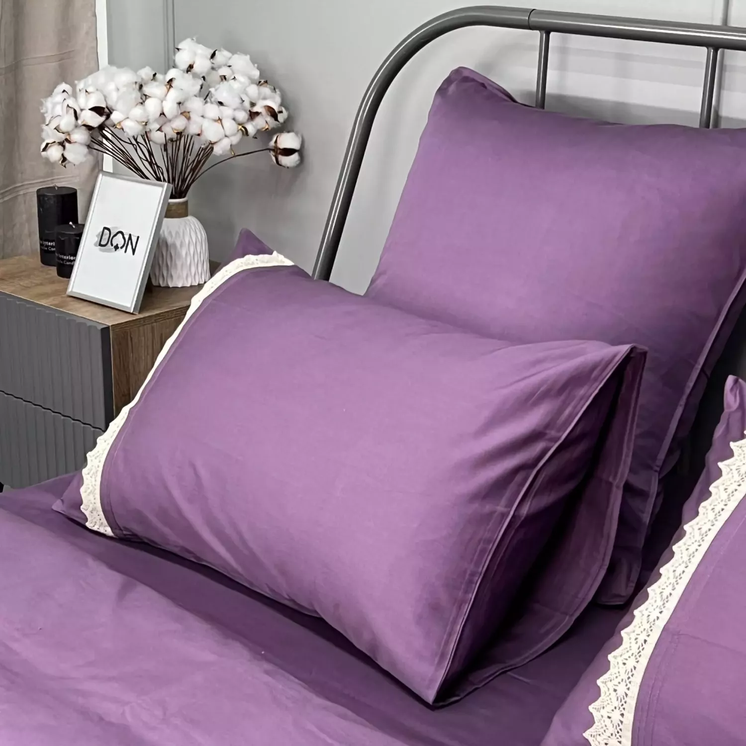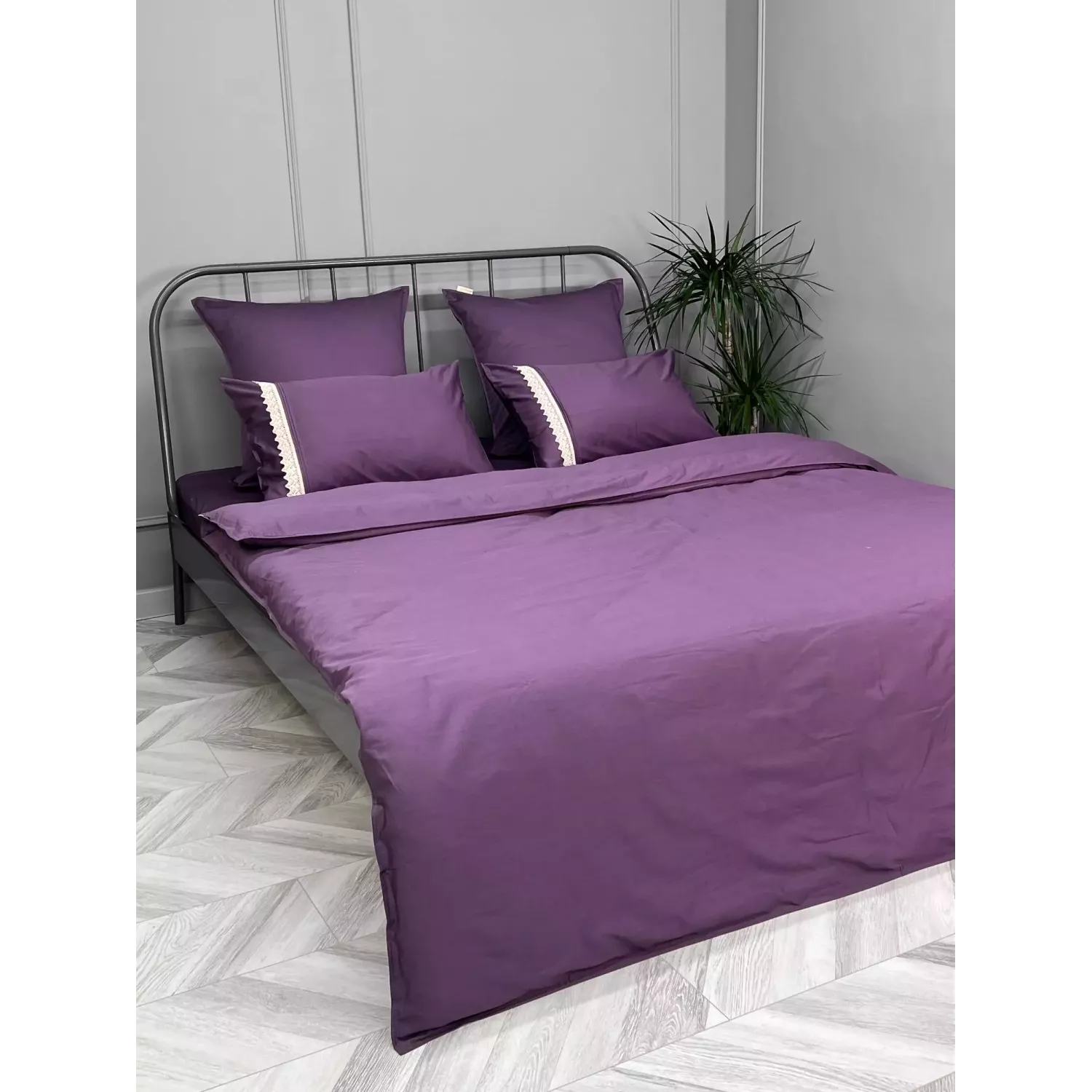 Пододеяльник имеет скрытую молнию, в наборе так же две однотонные наволочки 70х70 и две наволочки 50х70, которые выполнены с оригинальной кружевной полосой. Наволочки на запах, а пододеяльник также имеет кружевную полосу по краю.