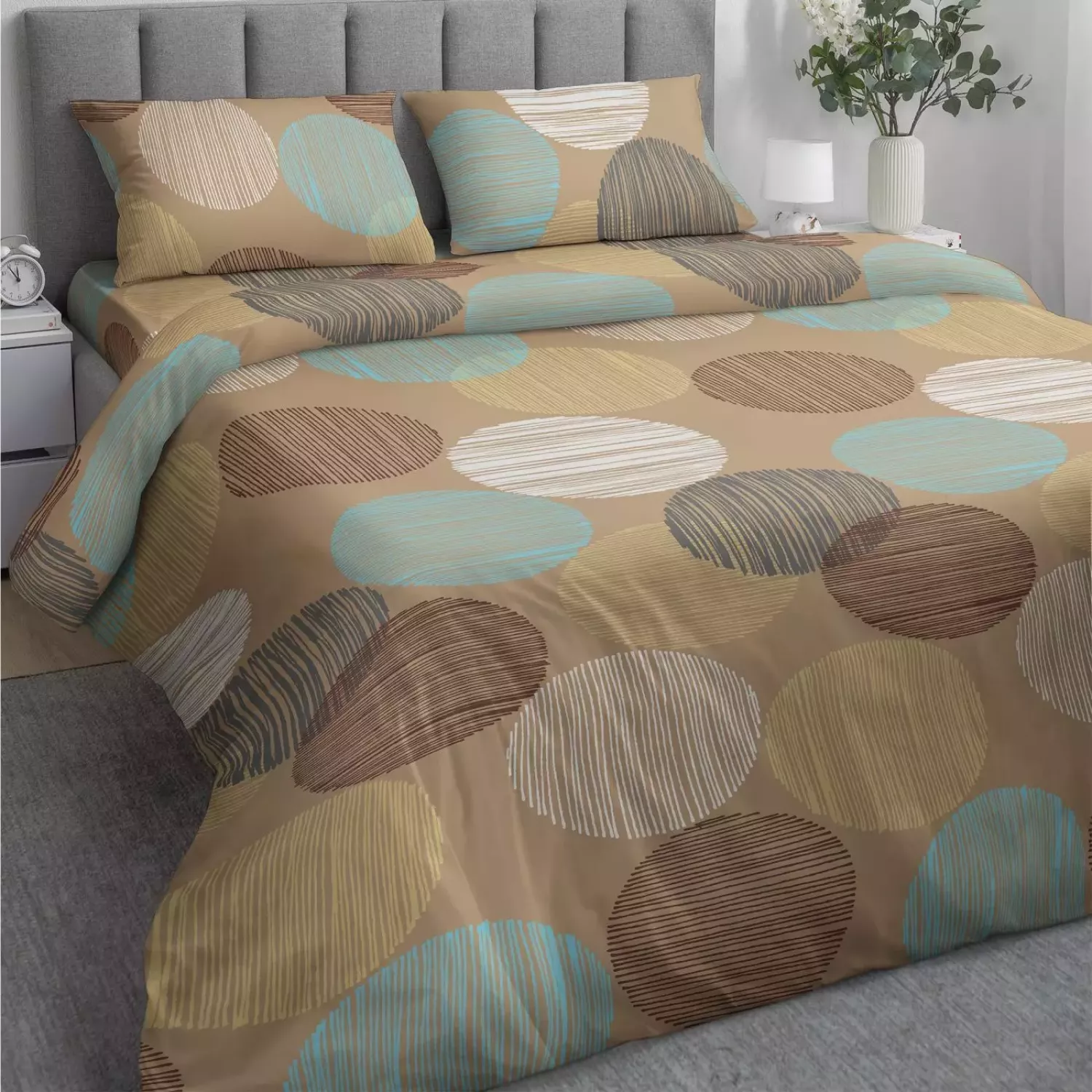 Комплект постельного белья “Самойловский текстиль” изготовлен в России (Иваново) из натурального 100% хлопка (бязи), отличающегося особой бархатистой структурой и чрезвычайной мягкой на ощупь поверхностью. Комплект неприхотлив в уходе, износостойкий, выдерживает большое количество стирок и радует своей доступной ценой и современным дизайном.
