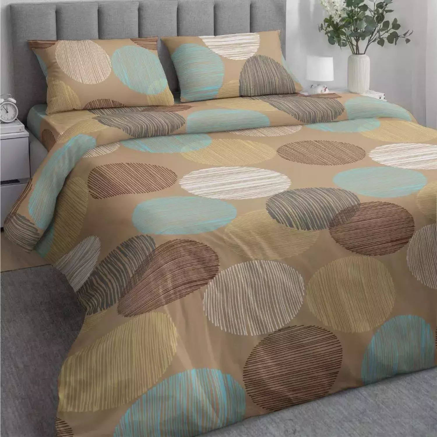Комплект постельного белья “Самойловский текстиль” изготовлен в России (Иваново) из натурального 100% хлопка (бязи), отличающегося особой бархатистой структурой и чрезвычайной мягкой на ощупь поверхностью. Комплект “Капучино” неприхотлив в уходе, износостойкий, выдерживает большое количество стирок и радует своей доступной ценой и современным дизайном.