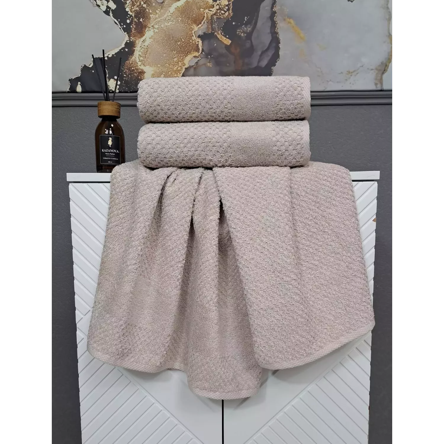 Набор однотонных махровых полотенец высокого качества “Gabriel” от текстильной компании Kazanov.a. Полотенца изготовлены из 100% натурального хлопка, махровое полотно соткано в технике Popcorn, с отделкой бордюром из стриженной махры с эффектом нежного велюра.